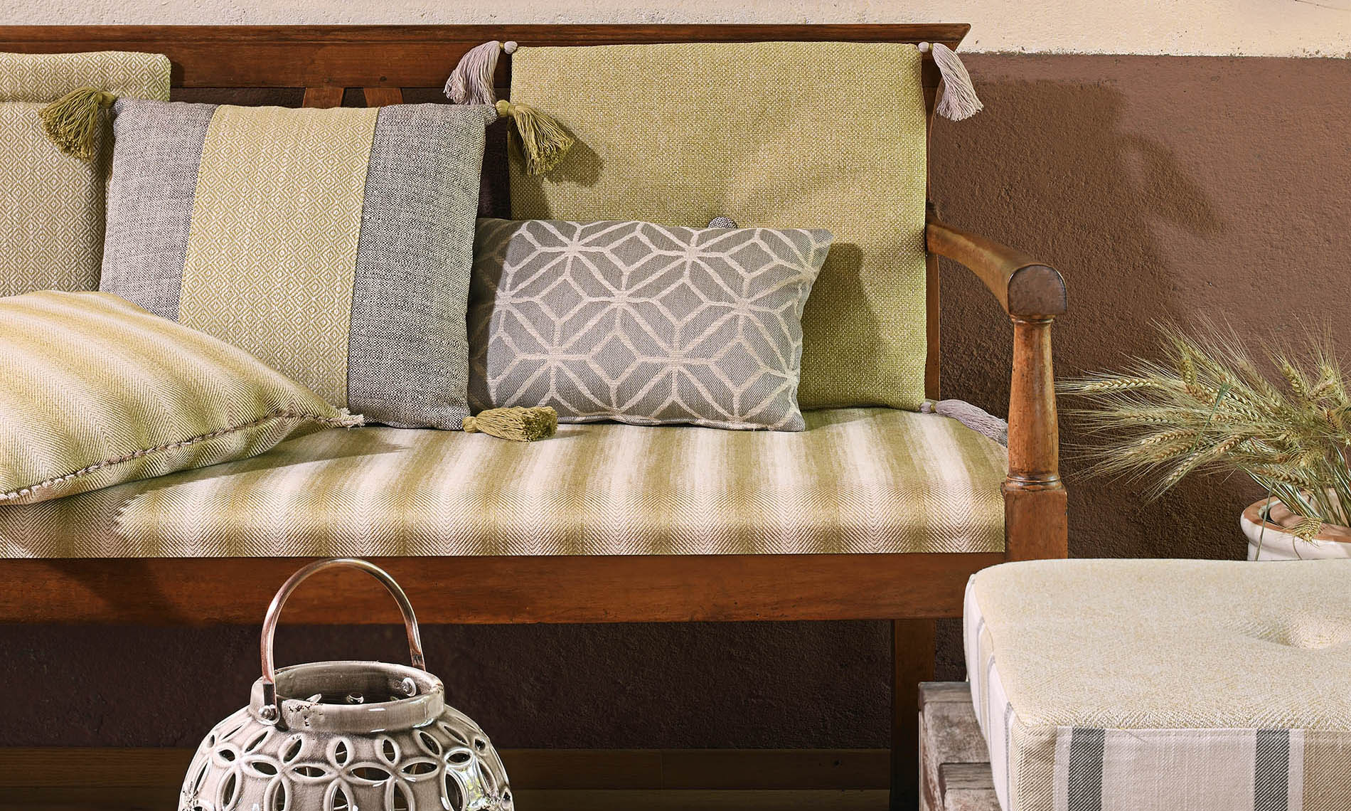 Refined combination of jacquard fabrics with geometrical designs and Chevron stripes, harmoniously combined with plaid and striped motifs revisited in trendy colours. The fabrics are made mainly with natural fibres and special weaves that highlight very tasteful textures and effects.